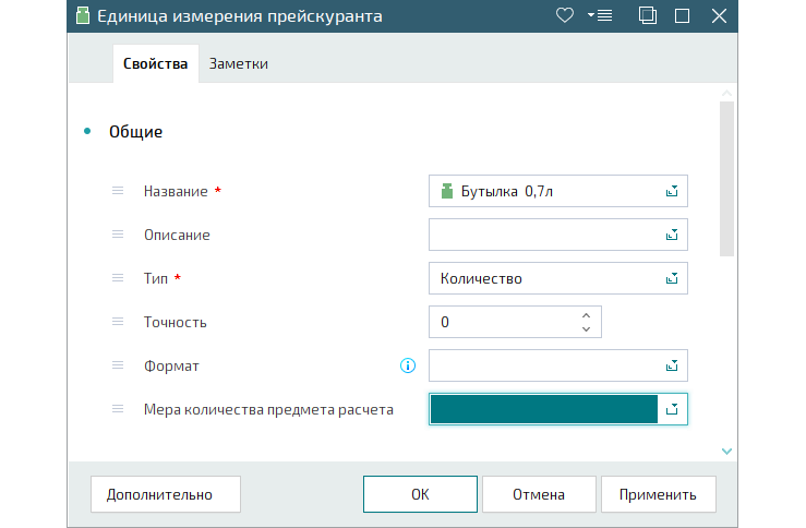 Чтобы включать в кассовые чеки, сформированные по ФФД версии 1.2, меру количества предмета расчета реализованных элементов прейскуранта, на панели «Свойства» карточки единицы измерения прейскуранта добавлено поле Мера количества предмета расчета.