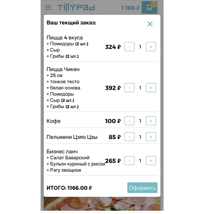 Гость добавляет блюда в заказ и нажимает «Оформить», после чего заказ автоматически отобразится в TillypadPOS, а марки - на Кухонном Дисплее или распечатаются на принтере кухни или бара. Заказ сразу начнут готовить. С помощью сервиса гость сможет в любой момент вызвать официанта в номер, при этом в TillypadPOS или на принтер чеков придет сообщение с указанием номера комнаты.